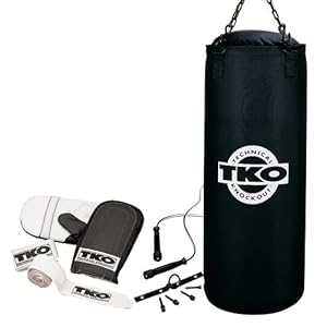 The five piece TKO 502CS-BK-50 Double-End Canvas 50-pound Heavy Bag Set has everything the recreational boxing enthusiast needs to get started on a workout. The black 50-pound heavy bag is of the double-end tie-down style, with an easy-care washable poly/canvas outer shell, chains, and a swivel. It comes with a set of all-purpose bag gloves as well as a set of heavy duty hand wraps. There is also a 10-foot adjustable skip rope to aid in your cardiovascular workout. These items and the included ceiling attachment with all the necessary installation hardware makes this a true, one-stop boxing package deal.About TKO Founded in 1996, TKO is a manufacturer in the fitness and boxing markets of the sporting goods industry. With more than 500 retail and commercial clients, TKO provides products-of-choice for elite boxing events, including the National Golden Gloves competition, IKF kickboxing tournaments and the International Female Boxing Association.
